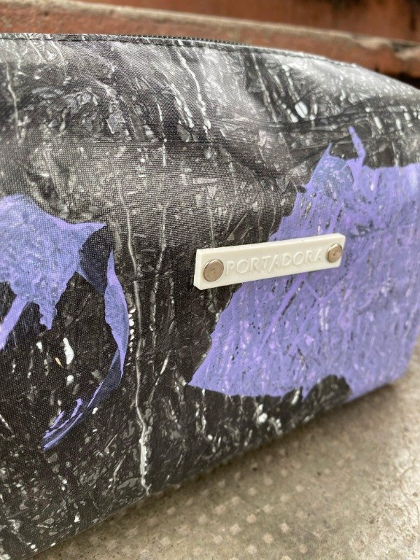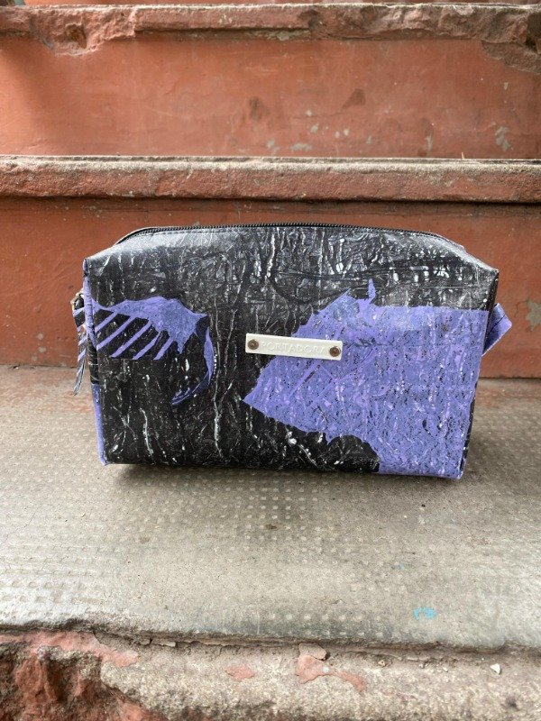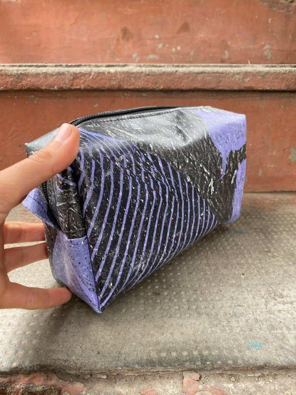 Hecho de bolsitas de plástico termofusionadas (sí, eso plateado son las bolsas de comida de mascotas, mezcladas con otras), este super estuche es idealísimo de neceser o cartuchera porque, como es impermeable, cualquier cosa que se rompa o vuelque, se limpia super fácil con un trapito y ya!